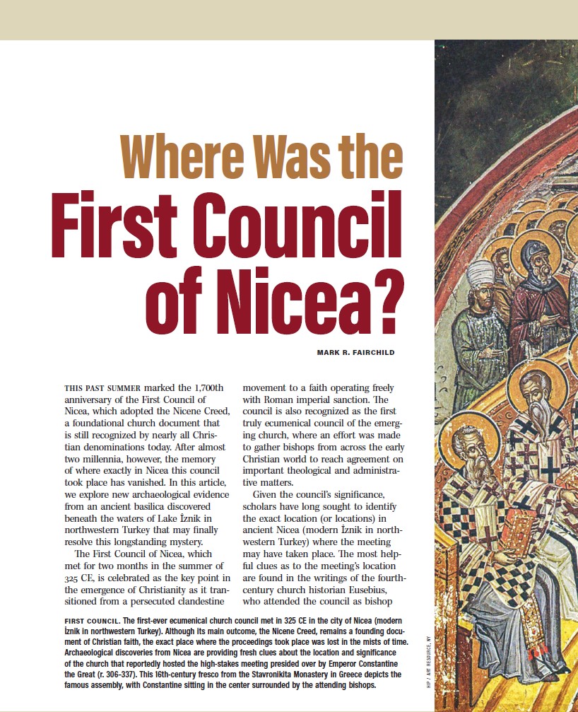 THIS PAST SUMMER marked the 1,700th anniversary of the First Council of Nicea, which adopted the Nicene Creed, a foundational church document that is still recognized by nearly all Christian denominations today. After almost two millennia, however, the memory of where exactly in Nicea this council took place has vanished. In this article, we explore new archaeological evidence from an ancient basilica discovered beneath the waters of Lake İznik in northwestern Turkey that may finally resolve this longstanding mystery.