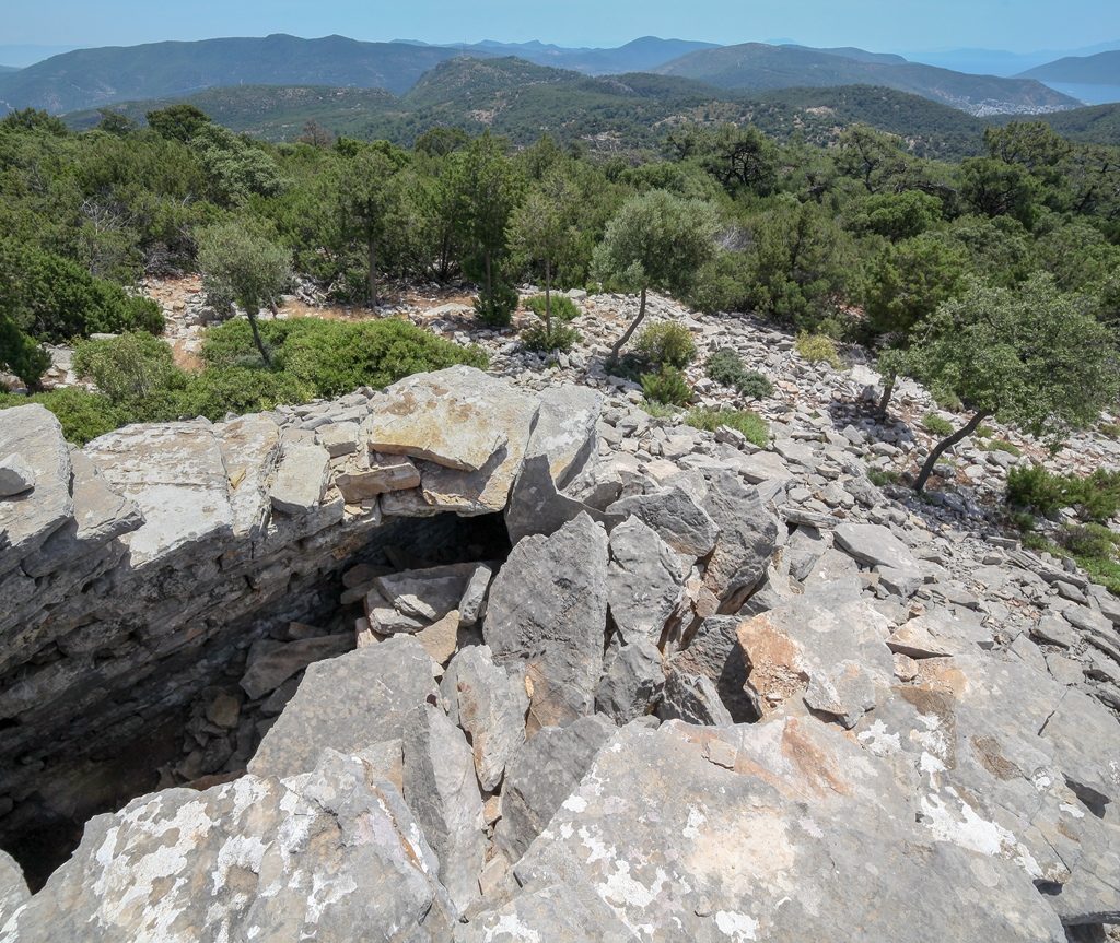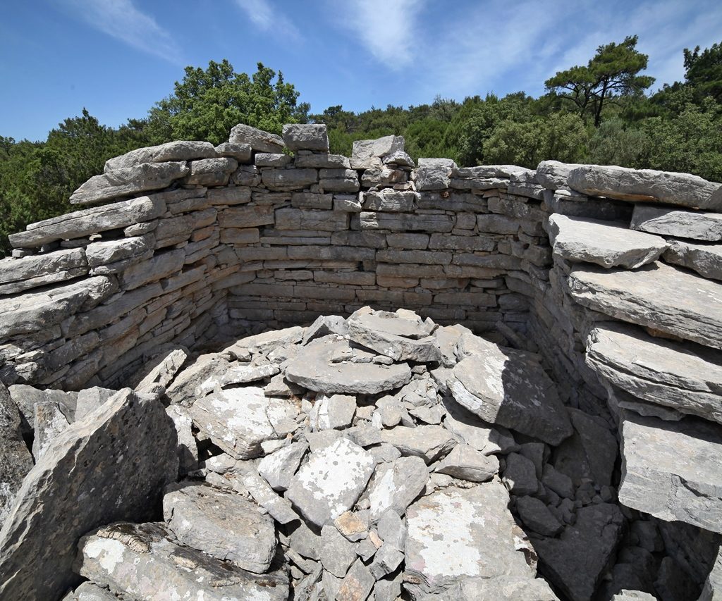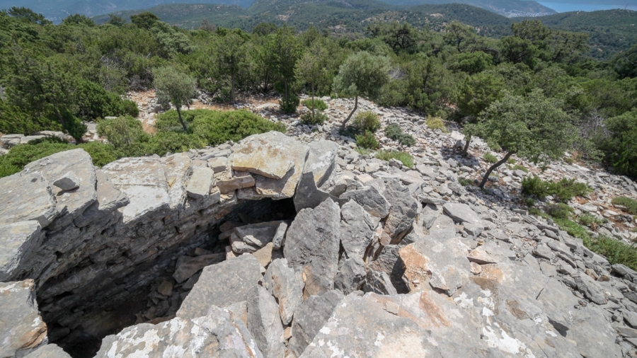 I hiked about 5 km (3 miles) up the mountain beyond Pedasa and was puzzled to see these at the top. There are two rock domes that were surrounded by a perimeter wall and were constructed with stone that was heaped up, creating a vault with a room in the center. They are not cisterns, as there was no water or plaster. Could they be tombs? Shrines? Further afoot there was a circular crumpled wall or stone rampart about 70 meters in diameter with the foundation of a squared structure in the middle.